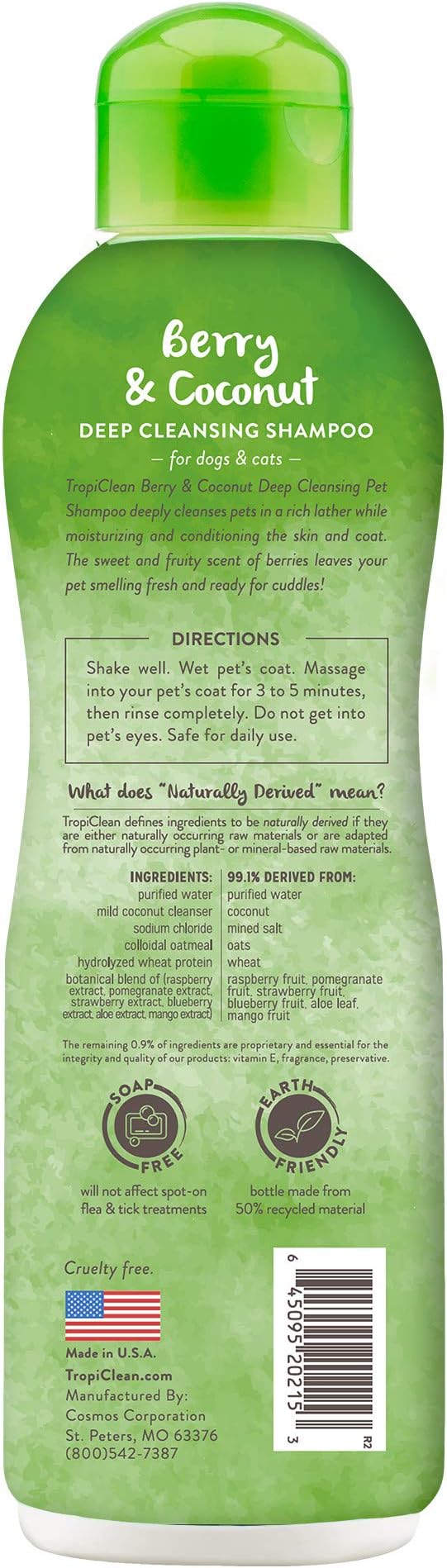 TropiClean Deodorizing Dog Shampoo for Smelly Pets, Long Lasting Odor Control, Puppy Safe, Made in the USA, Berry Scent, Cat Friendly, 20oz.