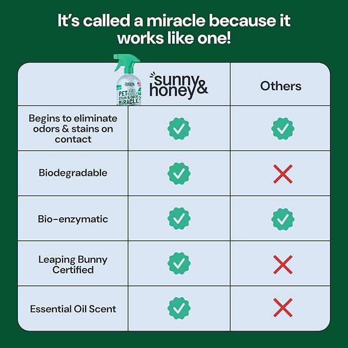 - Pet Stains & More: Meet Sunny & Honey Pet Stain Miracle, your go-to for tackling pet messes with ease. This enzyme cleaner for dog urine and poop carpet is a powerful ally in keeping your home fresh without harsh smells
