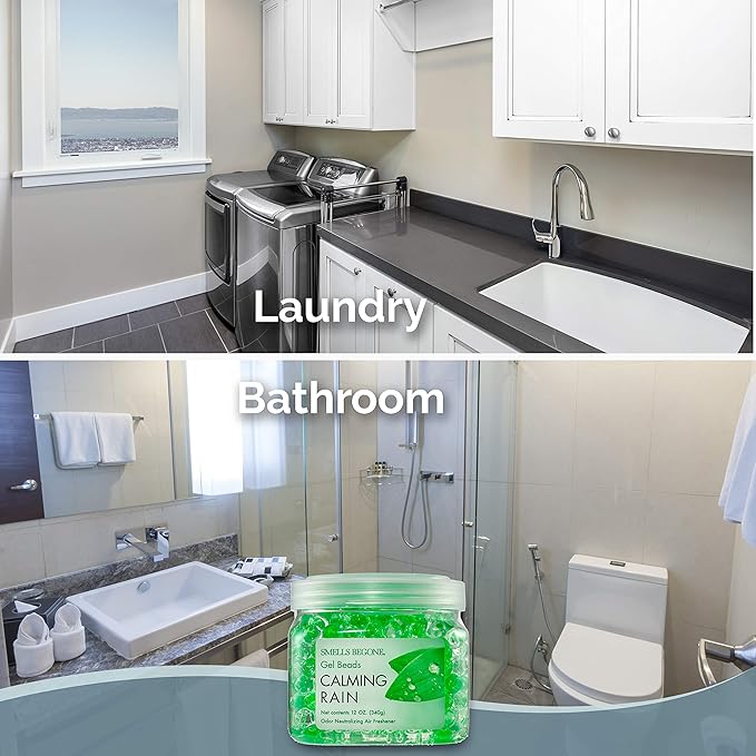 SMELLS BEGONE Odor Eliminator Gel Beads - 12 oz, Pack of 6 - Eliminates Odor in Bathrooms, Cars, Boats, RVs & Pet Areas - Air Freshener - Made with Essential Oils - Calming Rain Scent