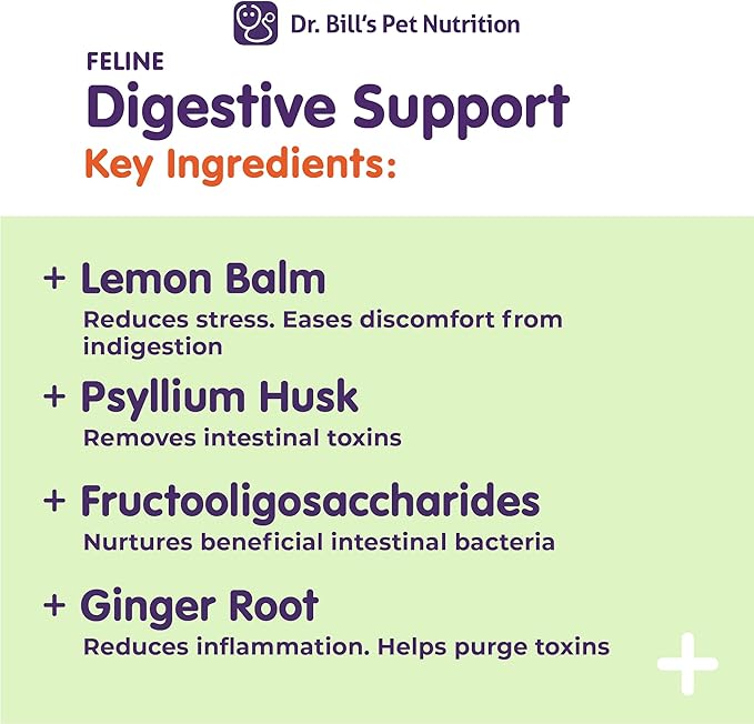 Dr. Bill's Feline Digestive Support Cat Prebiotics and Probiotics with Ginger Root, Psyllium Husk, Lemon Balm & More | 41 Active Ingredients for Better Digestion & Gut Health | Made in The USA
