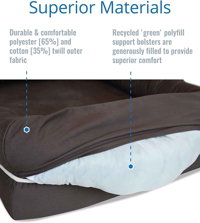 - PREMIUM COMPONENTS & BETTER HEALTH: (i) The SOLID 5 inch MEMORY FOAM in our orthopedic dog bed provides an ultra premium base for superior overall comfort, reduced joint pain (arthritis) and improved health, mobility, & energy. (ii) Comforts as a Calming dog bed for dogs who suffer from anxiety. (iii) Recycled 'green' support bolsters are generously filled. (iv) Durable & comfortable polyester (65%) & cotton (35%) twil