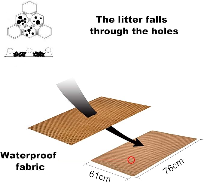 - Anti Tracking EZ Open Edge Litter Mat: Double-layer honeycomb design helps you gather the litter. You just pick up the mat and all the litter falls through and then dump it back in the litter box make it recycling. No more getting litter stuck to my feet on a daily basis! Large holes is large enough to catch and trap litter. Suitable for lots of type of litter, and kitty litter boxes,hooded,self cleaning litter box.