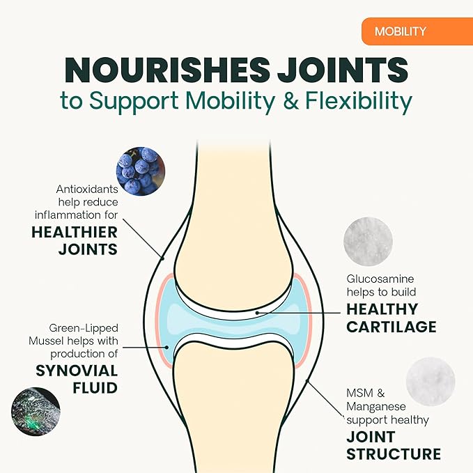 - EFFECTIVE INGREDIENTS: Made with nutritious, science-backed ingredients like glucosamine and MSM, green-lipped mussel, chondroitin, and antioxidants to help keep joints lubricated and comfortable during everyday activities that may put stress on the body