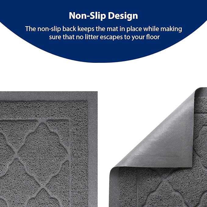 - [FEATURES]: This mat is long lasting, water & urine resistant, soft for paws and easy to clean. The non-slip back keeps the mat in place while making sure that no litter escapes to your floor. Elegant design blends beautifully with both modern and traditional home decor.
