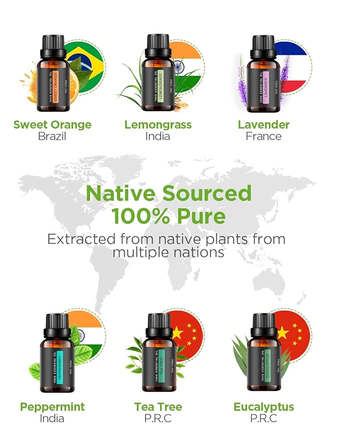 - Native Sourced, Bottled in the USA, 100% Pure: 6 scents include tea tree, lavender, eucalyptus, lemongrass, peppermint and sweet orange, which are extracted from native plants from multiple countries. With premium quality, each drop is 100% pure with no additives, fillers, bases or carriers added.