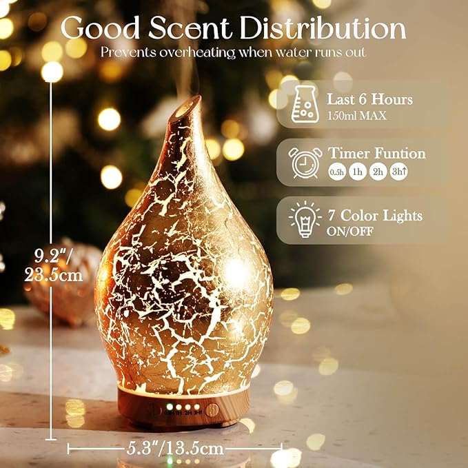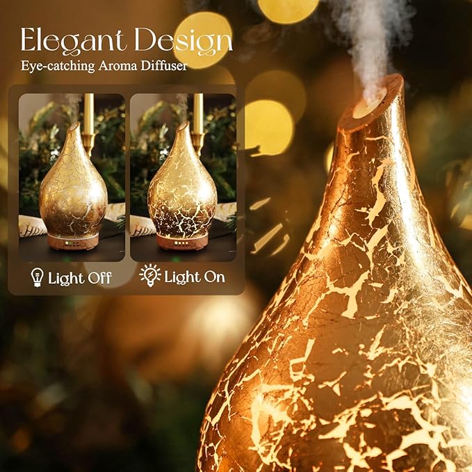 - UNIQUE ART DECORATIVE DESIGN - Our 150ml glass essential oil diffuser has a gold plated effect glass cover and wood grain decorative base. It is very suitable for your bedroom, living room, children's room, study room, office, and yoga room.