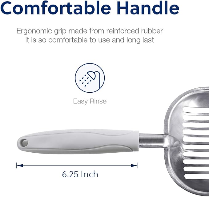 - [Features]: WePet made this scooper durable with heavy duty quality. After investigation with thousands thoughtful users, we finally make an improvement of removing the serrated edge as mentioned on reviews. The body is waterproof and very easy to clean, rust-resistant and corrosion resistant. It’s highly recommended by cat lovers for everyday use.