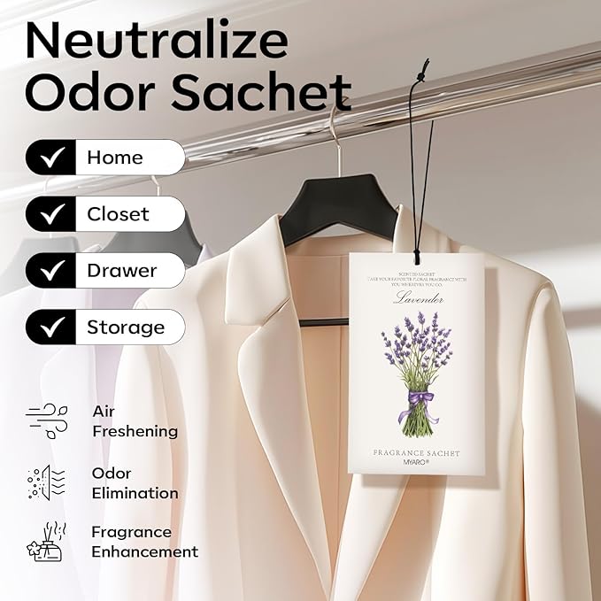 - Make Your Life Fragrant:A nice home fragrance sachets bring happiness and surprise, put the closet air freshener deodorizer scented sachets bags for drawer and closet to create a welcoming scent. Store a sachet near pet beds or pet crates.Pet areas smell fresher when you place a sachet near cat litter box. MYARO Sachet can fragrance rooms, closets, office, vehicles, storage, pet areas and more!
