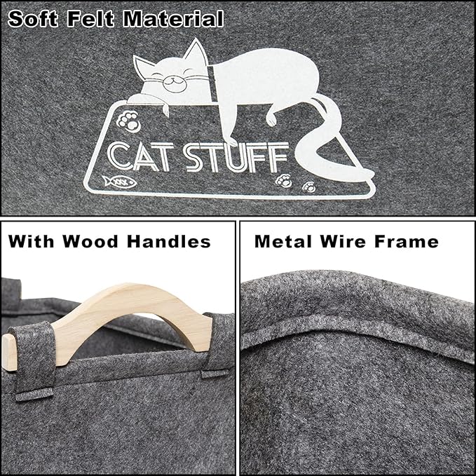 - ▶HIGH QUALITY: The cat toy box is made of heavy quality fiber soft felt material, soft and durable. With metal wire frame at the top, which to achieve the effect of stands upright. The wood handles make it easy to move or transport when needed.