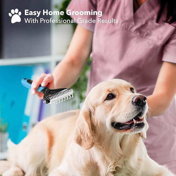 - Dual Headed Design - Unlike other pet grooming brush that come as a set with interchangeable heads, the 2-in-1 head design of our dog rake gives you the same convenience from a single unit. It has 9 more rounded blades on one side for de-matting and 17 razor-sharp blades on the other side for de-shedding.