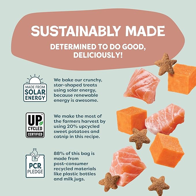 - Cat Treats for Skin & Coat Support: Your cat's skin & coat routine just upped its game. With a few of these delicious crunchy, star-shaped bites, they'll be doing the cat walk with perfection, from head to toe. Made with upcycled sweet potatoes, with added fish oils for that extra skin & coat support, your cat will be lookin' good and feelin' good. Includes three 2.5 oz bags.