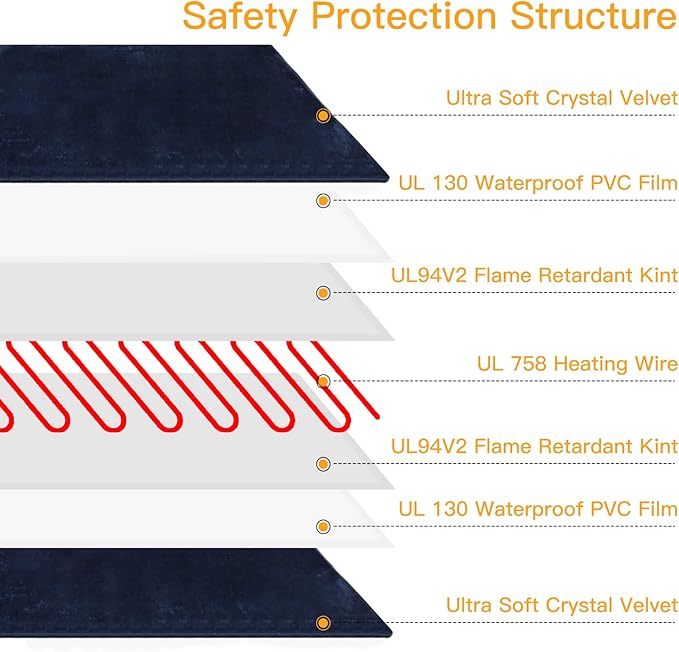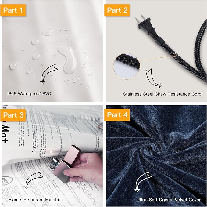 - ❤【Safety and Secure Structure】7-layer protective structure with UL-certified heating wire protect pets from burns. Soft PVC envelope with waterproof and flame-retardant function. Built-in intelligent temperature sensor in the heating pad to prevent overheating to protect pets. Don’t let your pets lay on the pet heating pad without a plush cover.