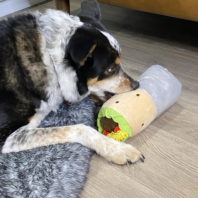 - Dog Toys Bundle: Our dog toys set includes a squeaky taco, a squeaky burritto and a crinkle sauce packet; Realistic food shaped dog toys provide hours of fun while keeping your dog busy