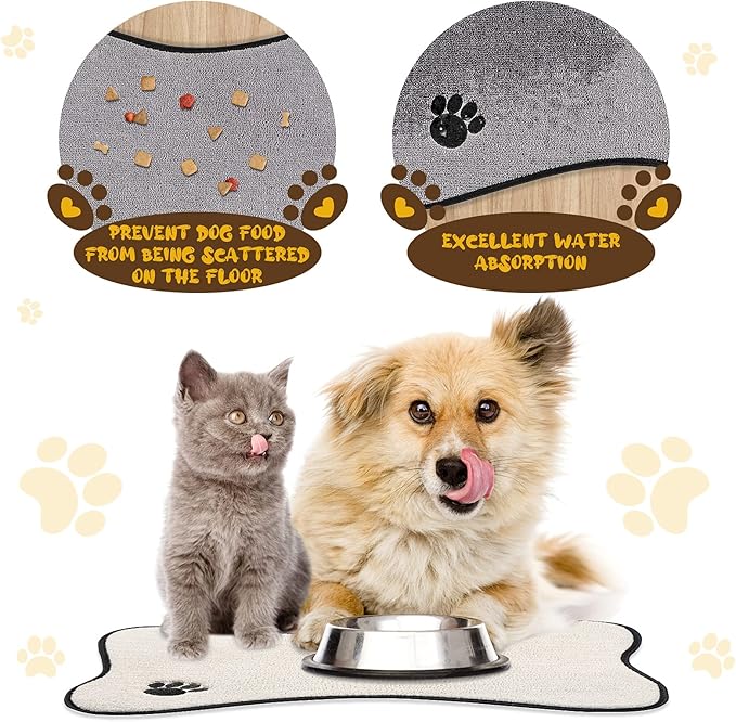 Breling Dog Mat for Food and Water 2 Pieces Bone Shape Non-Slip Pet Feeding Mat for Under Dog Bowls Embroidered Microfiber Pet Bowl Water Absorbent Feeding Supplies, 2 Colors