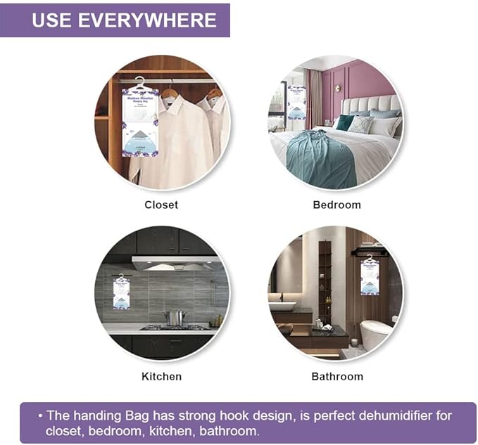 - The multi-purpose hanging bag design is very suitable for families and enclosed spaces, such as closets, laundry, boats, basements or RV closets, to solve the moisture problem in these places.