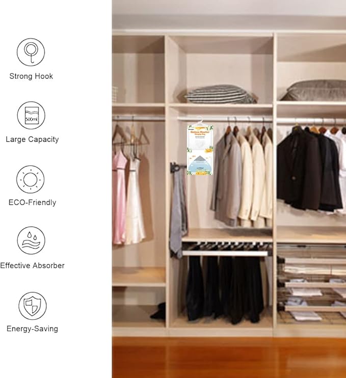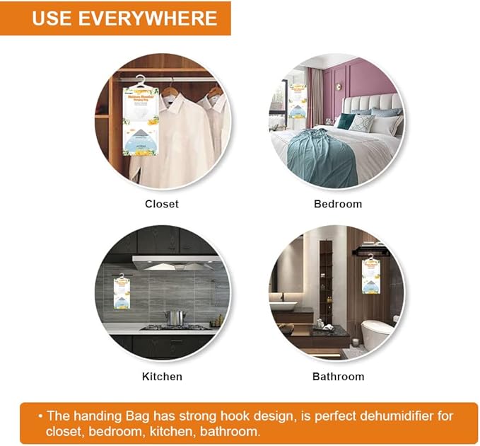 - The multi-purpose hanging bag design is very suitable for families and enclosed spaces, such as closets, laundry, boats, basements or RV closets, to solve the moisture problem in these places.