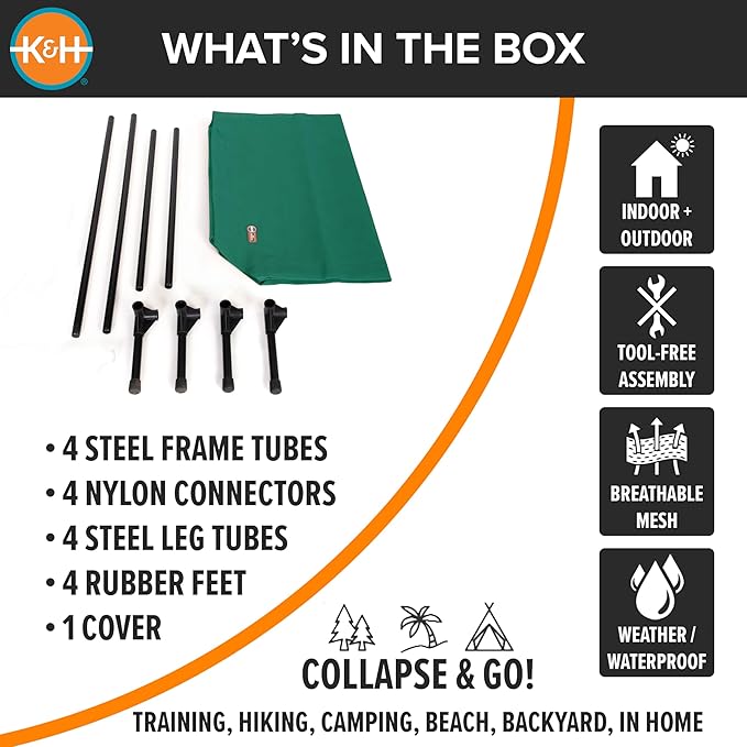 - EASY TOOL-FREE ASSEMBLY: Collapsible outdoor dog cot is easy to assemble and disassemble, no tools necessary making this portable bed great for use at home or during travel, camping, picnicking, place cot for dog training and more