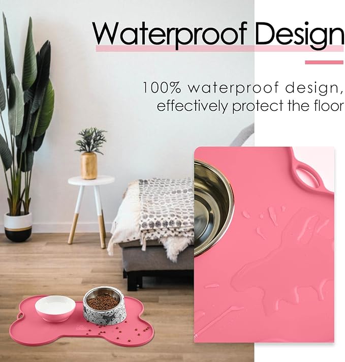 Super Design Dog Food Mat Dog Bowl Mat for Food and Water Silicone Non Spill Cat Feeding Mat Puppy Placemat Waterproof - 20.5" x 14.5", Pink
