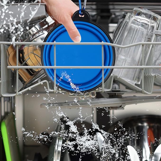- EASY TO CLEAN: these compact dog food bowls are dishwasher safe,hand wash also available.Please rinse or wipe clean the bowl after each use.One set come with 2 different colors,so easy to consistently designate one bowl for food and one bowl for water.Great pet travel bowls for on the go.