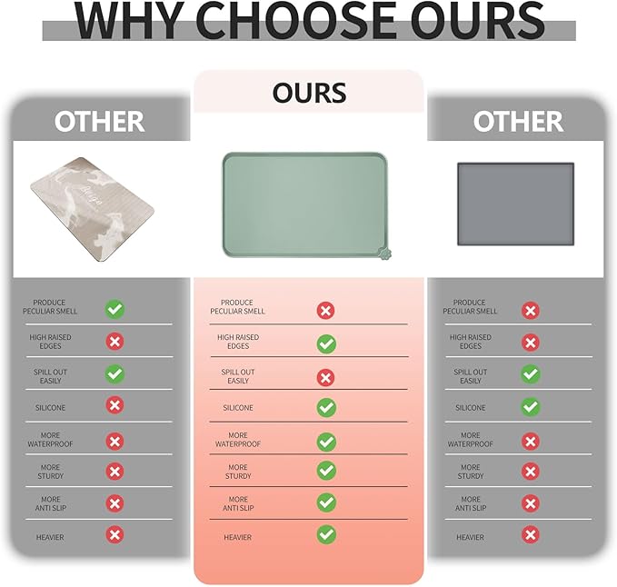 - Various sizes available: our pet mats come in 5 different sizes - 18.5" x 11.5", 22" x 14", 24" x 16", 28" x 18", and 32" x 24". Suitable for all kinds of pets, from puppies to large pets, choose the perfect size for your furry friends and avoid messy spills at mealtime