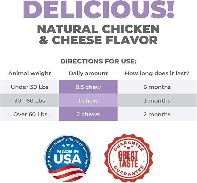 - Natural Chicken & Cheese Flavor: 100 chews and up to 6-month supply; a great alternative to pet calming supplements in liquids and pills