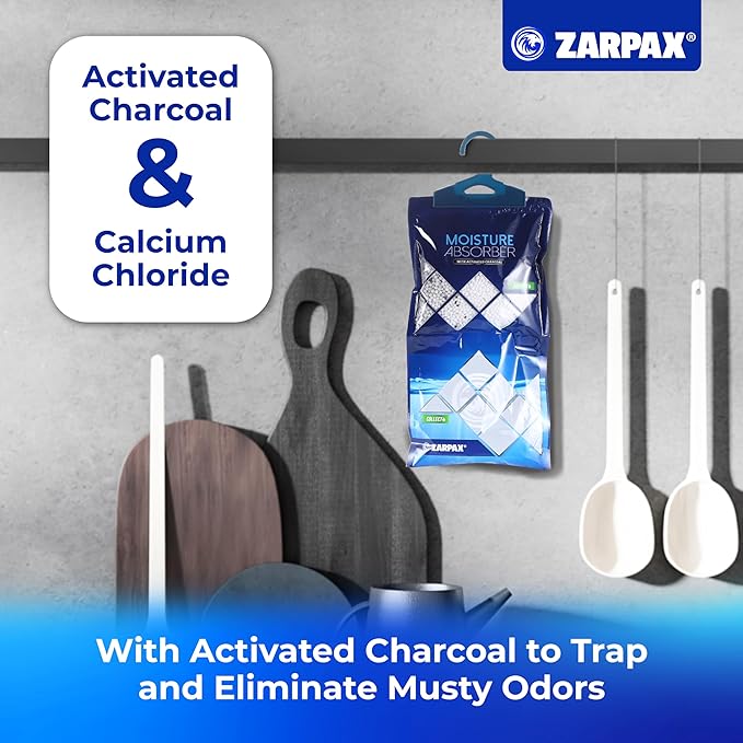- POTENT MOISTURE ABSORPTION: Bid farewell to moisture and create a dry, comfortable indoor atmosphere with the ZARPAX hanging moisture absorber with activated charcoal. This easy-to-use packet provides an effective solution to protecting your home and valuables from excess moisture. Our humidity absorbers are the perfect solution for moisture-prone areas and ensure your closets, bathroom, and laundry rooms stay dry and odor-free.
