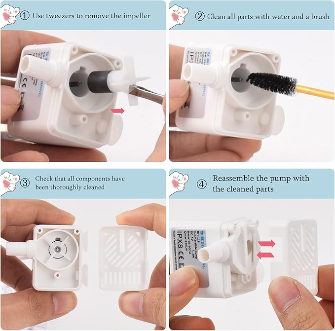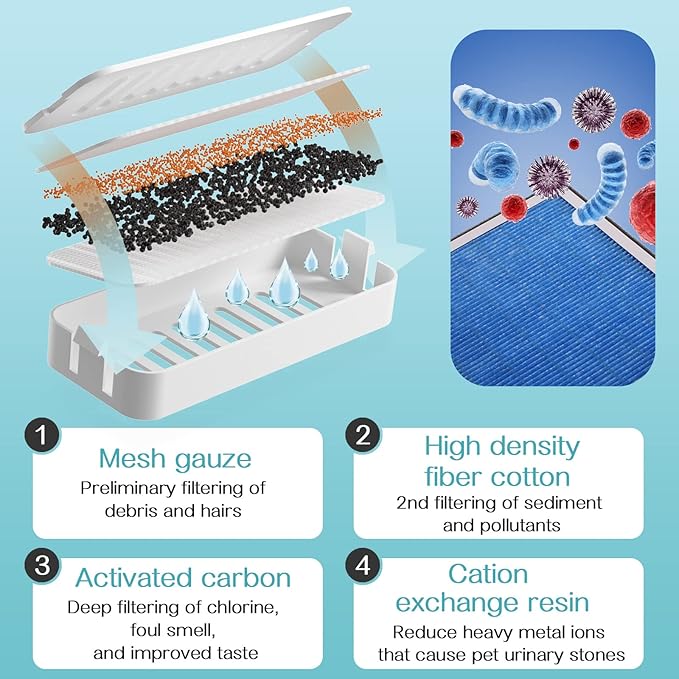 - 【Easy to Install & Clean】Cat fountain water bowl is easy to assemble. BPA-free dishwashers are safe and easy to clean. For your pet's health, we recommend changing filters and cleaning the pump and fountain every 2-3 weeks. Made from superior quality non-toxic and odor-free plastic materials, the pet fountain will last for years of everyday use. It includes a quadruple filter and a small energy-efficient pump with a power cord.