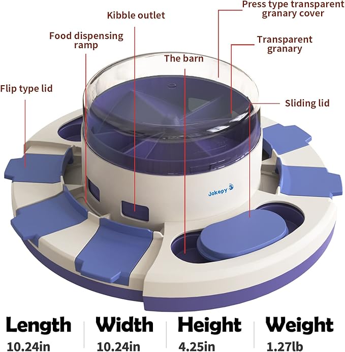 - 🐾【Easy to Use】Dog puzzle toys have 6 flip type lids, you can add food to the granary, pets press down on the transparent lid, food will fall into the leaky food-box. Pets also can eat food by moving 2 sliding lids.