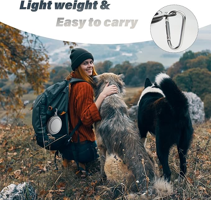 - PORTABLE & CONVENIENT: The collapsible pet feeding and watering bowls are lightweight and easy to carry,can be folded down to a compact size,making them easy to store in bags or cars.Come with 2 carabiners, the compact travel bowls can be attached to belt loop,backpack,dog leash,dog collars,dog carrier,bags,luggage and more.Suitable for outdoor/indoor acitivies,outings and trips.