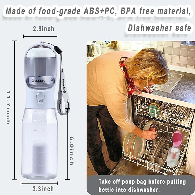 - Safe and Heat Resistant Material & Widely Uses: The dog water bottle is made of food grade ABS+PC, BPA free material. 250℉/121℃ affordable and dishwasher safe. It’s suitable for walking, travelling, picnic, camping, hiking, training with your pets