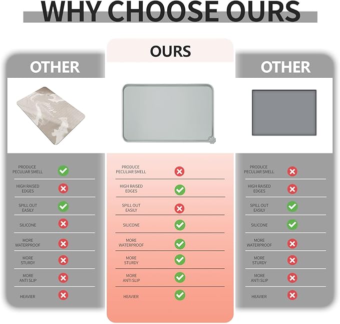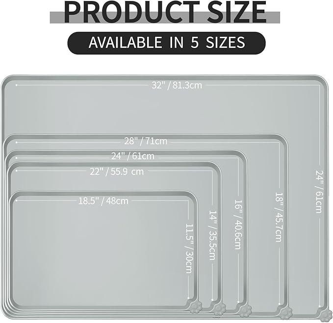 - Various sizes available: our pet mats come in 5 different sizes - 18.5" x 11.5", 22" x 14", 24" x 16", 28" x 18", and 32" x 24". Suitable for all kinds of pets, from puppies to large pets, choose the perfect size for your furry friends and avoid messy spills at mealtime