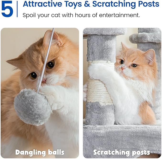 - Multi-Functional Cat Activity Center: Equipped with two padded perches, a cozy hammock, eleven scratching posts, and two fluffy pom-poms, this cat tree combines rest and play seamlessly