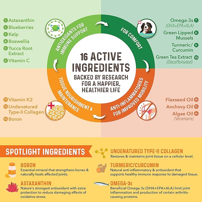 - CLEAN, TRUSTED & SAFE: All-natural, tastes great, no artificial colors or flavors, no corn or wheat, and easy to digest. Rooted in dog hip, joint and mobility care science. GMP and SQF certified, quality tested, and made in the USA.