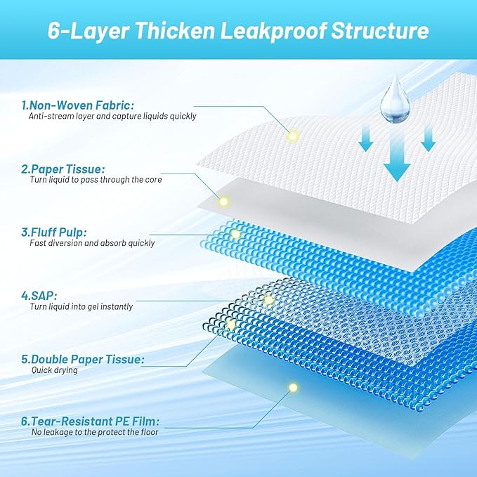 - Super Absorbent & Quick Drying: The 6-layer protection design makes our thickened puppy pads pet training pads much more absorbent, perforated film as the top layer of the pee pads which can speed up the liquid to pass through the surface than common non-woven fabric and keep the surface quick-drying
