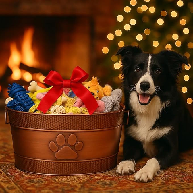 - SPECIFICATIONS: Material: Heavy-duty galvanized steel large dog toy basket. Color: Antique Copper with Paw Print. Size: 21”L x 14”W x 9”H. Capacity: 25qt / 6 gallon
