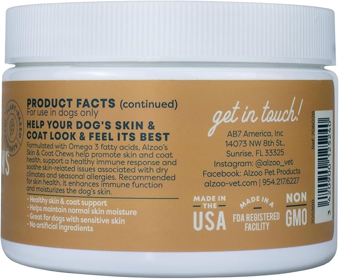 - Alzoo Skin & Coat Chews help keep your dog’s skin & coat looking and feeling its best