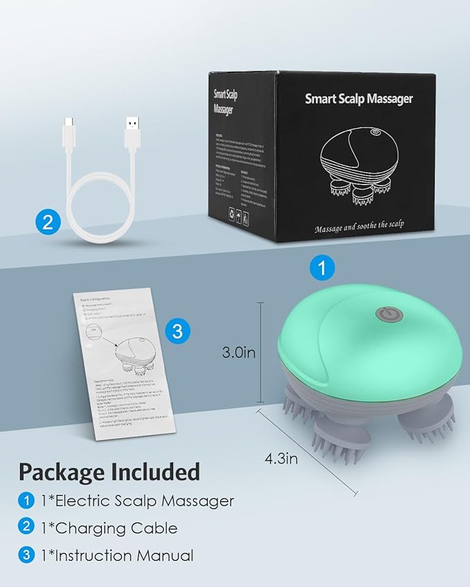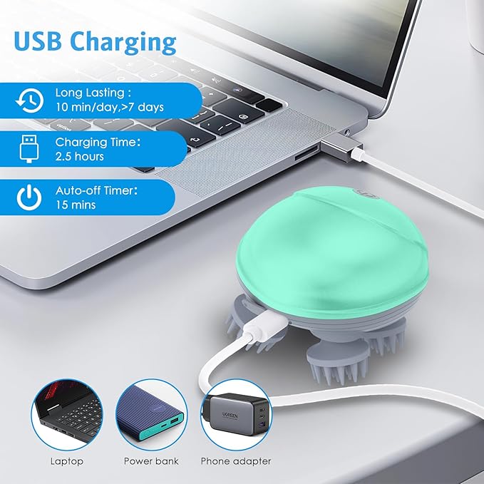 - 【Pocket Size & USB Rechargeable】Featuring a cordless portable design, so you can enjoy a massage anytime and anywhere. USB charging is easy with your power bank, laptop or phone adapter. Electric scalp massager can last up to a week on a full charge (Automatically turn off after 15 minutes)
