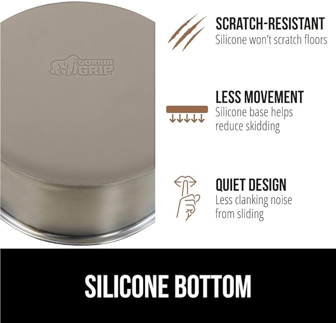 - SILICONE BOTTOM: the Gorilla Grip bowl is constructed from durable silicone that helps keep the bowl steady and won’t scratch your floors; while some over eager eaters may still be able to slide the bowls, the silicone will help prevent much movement; plus, it reduces the noise from clanking and sliding across wood, tile, and more
