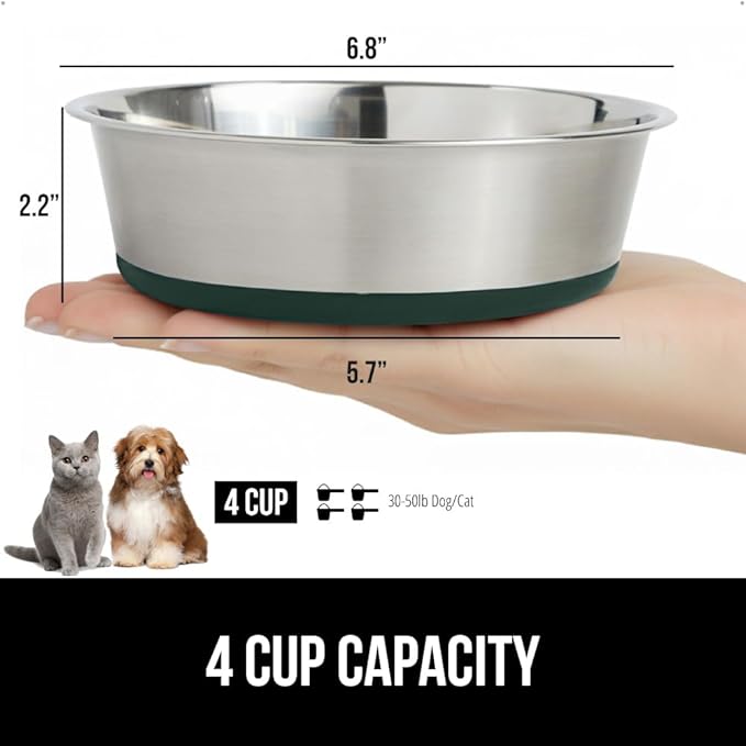 GORILLA GRIP Set of 2 Dog Bowls, Holds 4 Cups (32 fl oz), Heavy Duty Metal Food and Water Bowl for Feeding Dogs and Cats, Dishwasher Safe, Rust Resistant Stainless Steel, BPA Free Rubber Base, Green