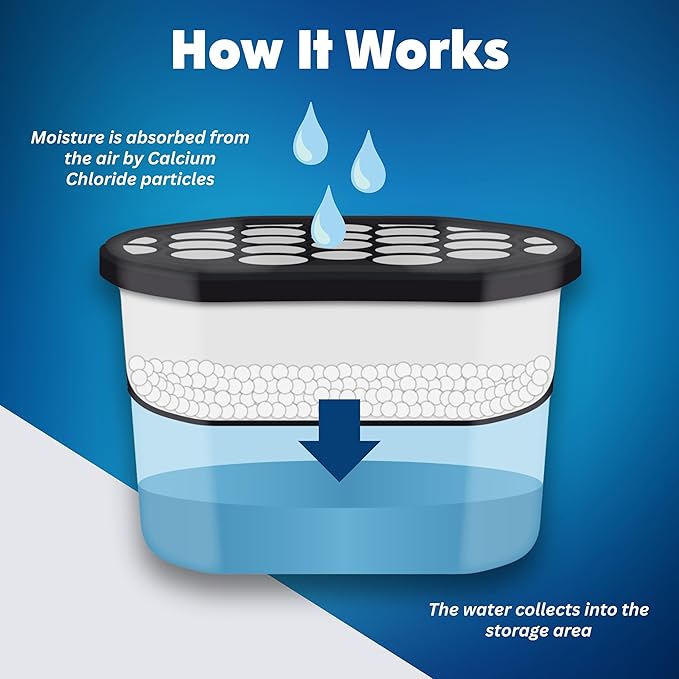 - Absorbs Excess Moisture: Our moisture absorber and deodorizer box contains spherical calcium chloride for maximum absorption. Once moisture is absorbed, it is stored in the robust water catchment area.