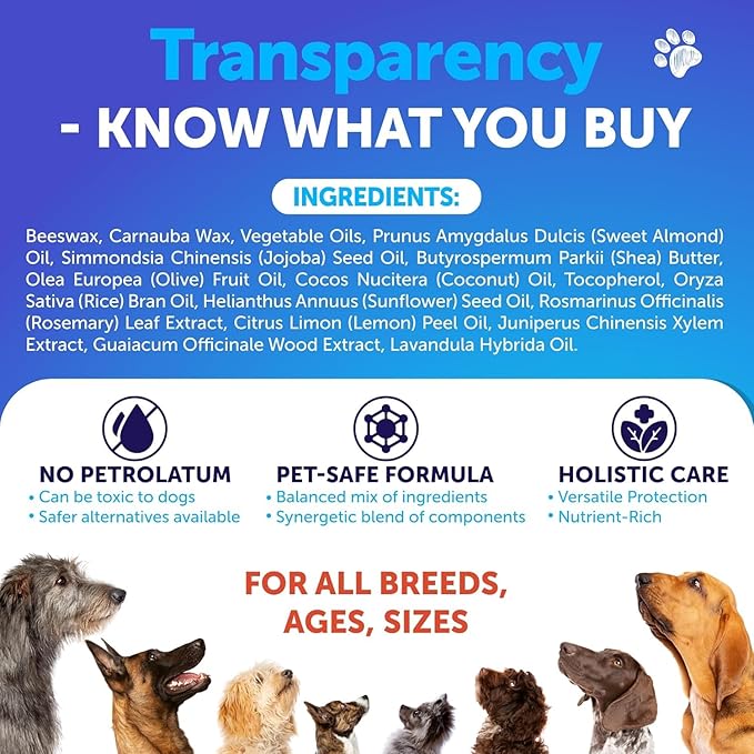 - All-Season Protection: Safeguard your pet's paws with our dog balm for paws and nose, offering year-round defense against drying, cracking, and damage from snow, hot pavement, and rough terrains