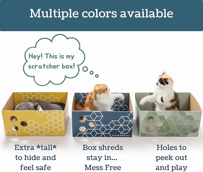 - [CATS LOVE BOXES, YOU LOVE NO MESS] We all know cats like boxes. As soon as they see one, they are interested in the box more than anything else. Get rid of that boring shipping box, and get something cute *and* durable with specially designed peekapoo holes so they can play, hide, scratch, and sleep. BONUS… this scratcher keeps all the shreds in = NO MESS for you to clean up!