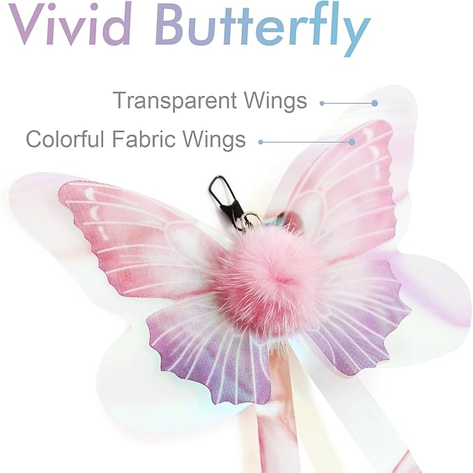 - [VIVID BUTTERFLY TOYS] The cat wand toys come with 6 colourful butterfly refills, The two-layer iridescent wings with long tails design makes the butterfly looks like a real butterfly when it is flying. Very vivid and beautiful. With the sound of bell attached the toys, the butterfly can attract the cat's attention and stimulate the cat's hunting nature instinct.