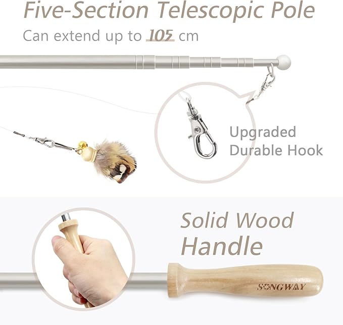 - [THICKER CAT WAND] The upgraded cat wand is more sturdy and durable. It comes with a solid wood handle. The pole is strong and retractable, it can be stretched from 9.8 to 39 inches, easy to carry and store.