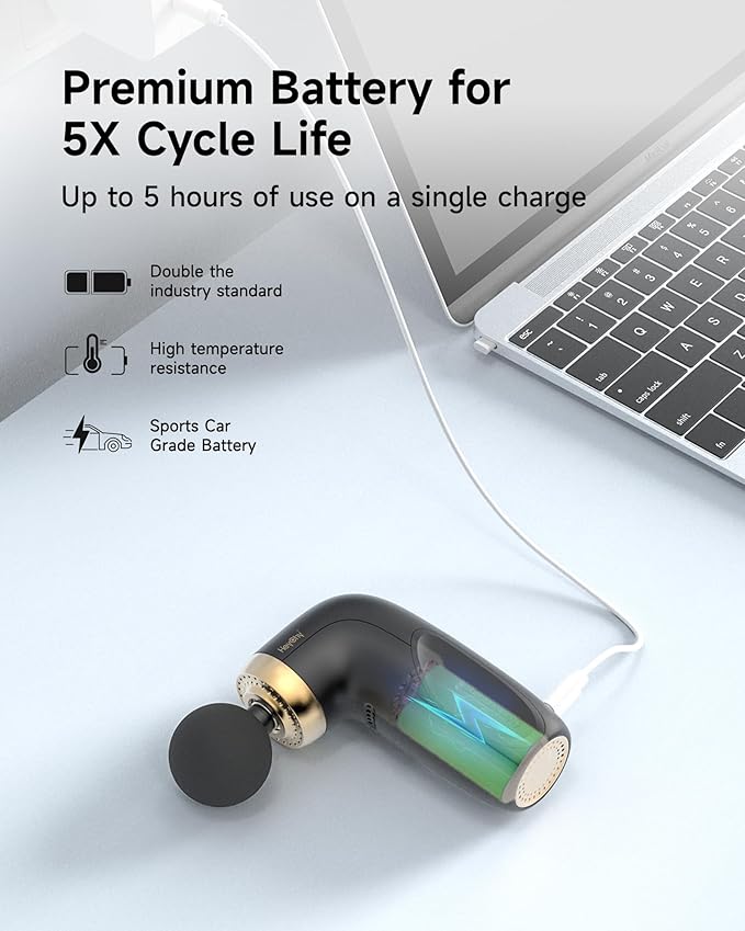 - 【Ultra-Superior 3C Power Battery】This handled muscle massager gun is specially equipped with 3C Power Battery. Compared with other products, it has 3X discharge rate for power supply and 5X battery cycle life. At the same time, 800mAh battery capacity allows it to be used continuously for 5-7 hours.