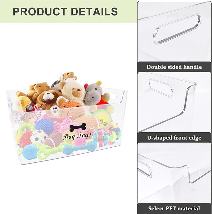 - ▶ Clear Plastic Dog Toy Bin- Plastic clear acrylic toy basket wipes off easily and never rusts or decays. This puppy toys basket will resist scratching, denting, and damage no matter how mischievous the dog is.this dog toy bin is great for dog toy/leash/blanket/clothes or dog treat.