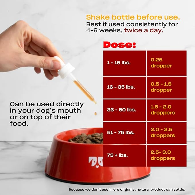 - Super Easy to Use: Pop this calming tincture directly into your dog’s mouth or drizzle it over their food. "Dog’s choice," as we like to say