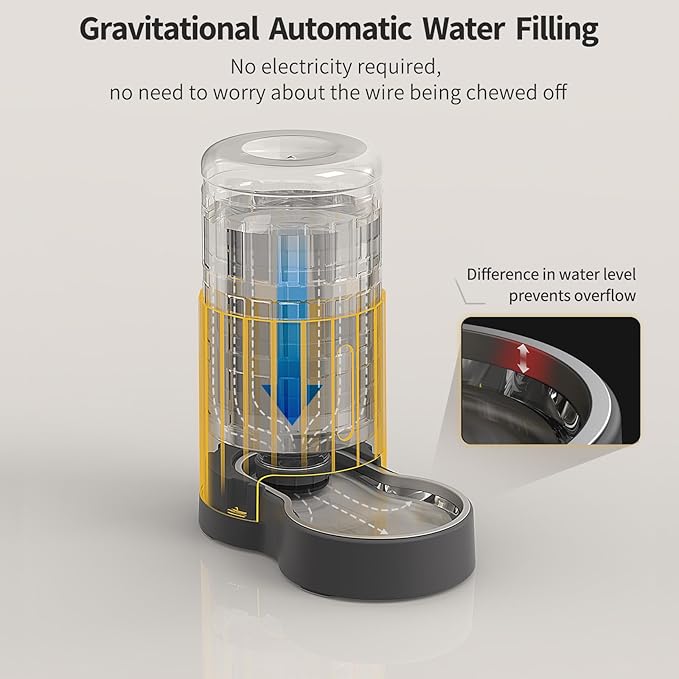 - Gravity Automatic Refill & No Leakage - This pet waterer uses gravity to fill the water on its own, no electricity required, so you don't have to worry about the cord being chewed. The gravity water bowl for cats will automatically stop filling to prevent overflowing when the water in the base reaches a specific height.