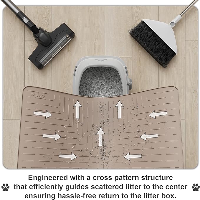 - Easy to Clean: This unique inner pattern ensures that no matter which side you lift the mat, the cat litter naturally flows along the grooves toward the center — making it easy to pour back into the litter box or sweep away with a broom. For quick cleanup, simply shake off or rinse the mat with water to remove any remaining litter, leaving it clean and ready for reuse