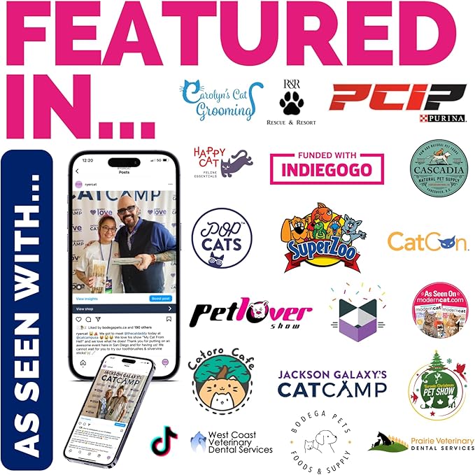 - [ Resources & Education ] Unlock the secrets of feline oral health with RYERCAT's PATENTED DESIGN and comprehensive educational resources! Our founder, a Registered Nurse in Dental Anesthesia, brings professional expertise to guide you through the learning curve of cat teeth brushing. Join millions on TikTok learning 'How to Brush your catโs teeth' As well as recorded speaker events at Meowfest 2022. Our goal is to Redefine Feline Oral Health